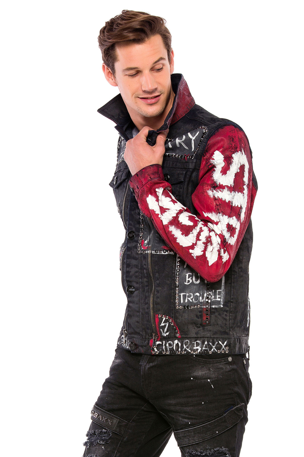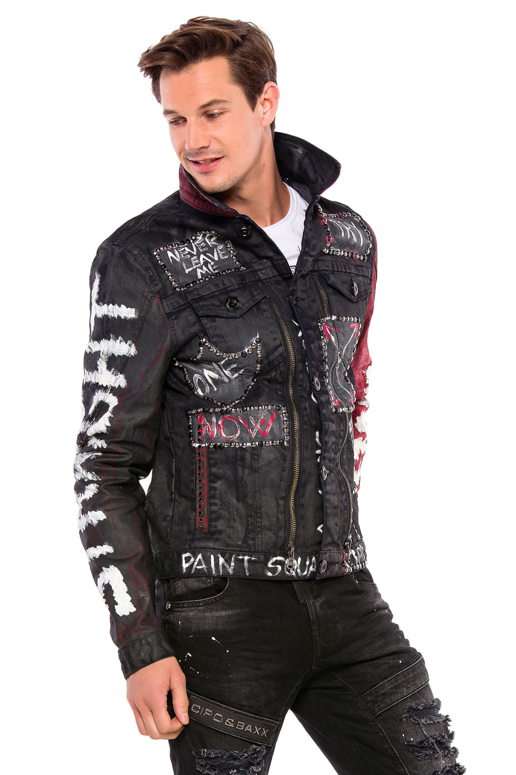 A Cipo & Baxx egy egyedi, kézzel készített farmerkabátot mutat be, amely számos részletével tűnik ki. Fekete szegecsek és díszkövek, valamint cipzárak és kézzel felhelyezett fehér feliratok találhatók az egész darabon. Tűnj ki a tömegből, mert minden darab valóban egyedi!