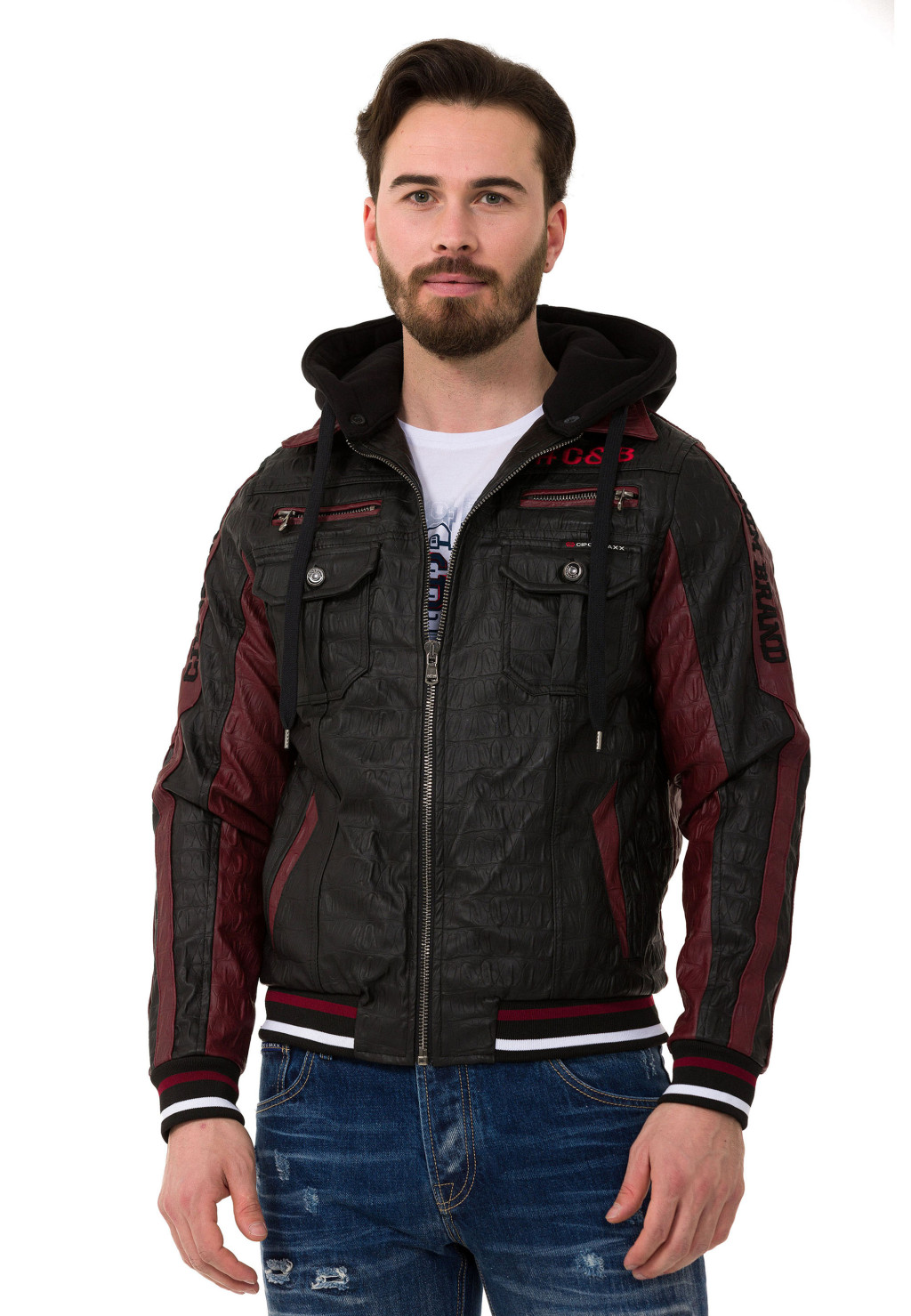 CJ284 Férfi műbőr kabát kapucnival, menő megjelenéssel