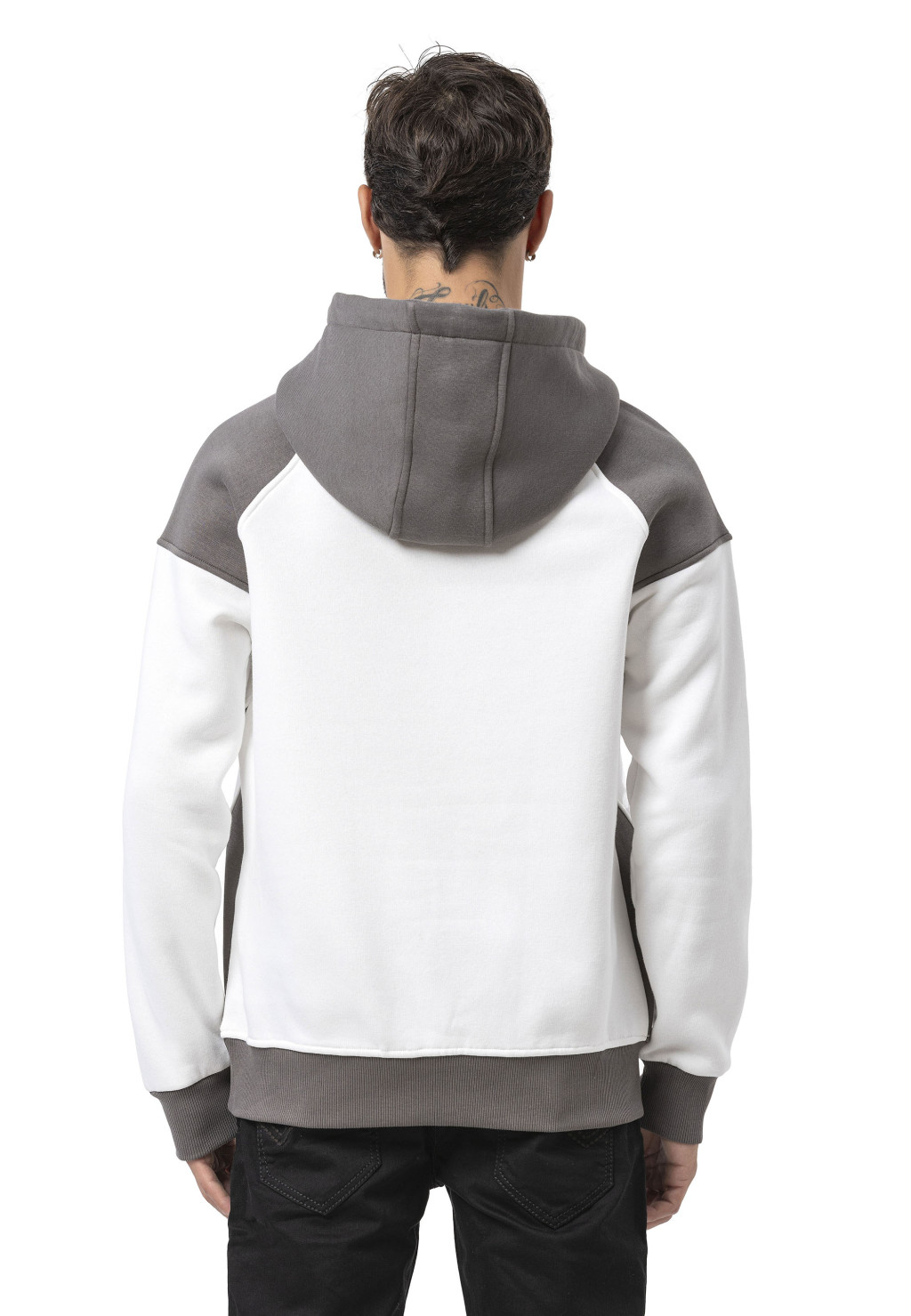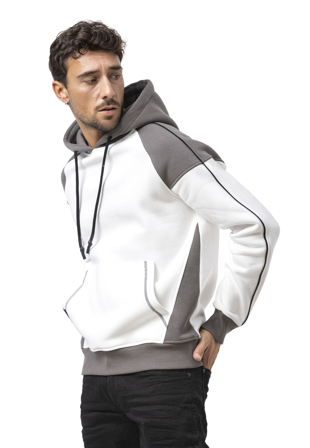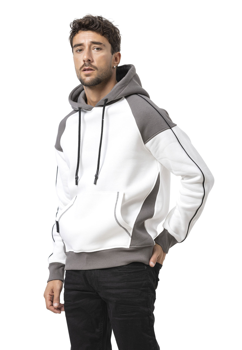 Der CL591 Herren Hoodie Sweatshirt überzeugt durch sein minimalistisches Design mit markanten Kontrasten. Der weiße Ecru-Körper kombiniert mit dunkelgrauen Ärmeln, Kapuze und Saum sorgt für einen modernen, urbanen Look. Die schwarzen Kordeln und die dezente Paspelierung entlang der Ärmel runden das Design ab. Die Fronttasche bietet praktischen Stauraum, während der weiche Sweatstoff für angenehmen Tragekomfort sorgt – ideal für Alltag, Freizeit und Übergangszeit.
