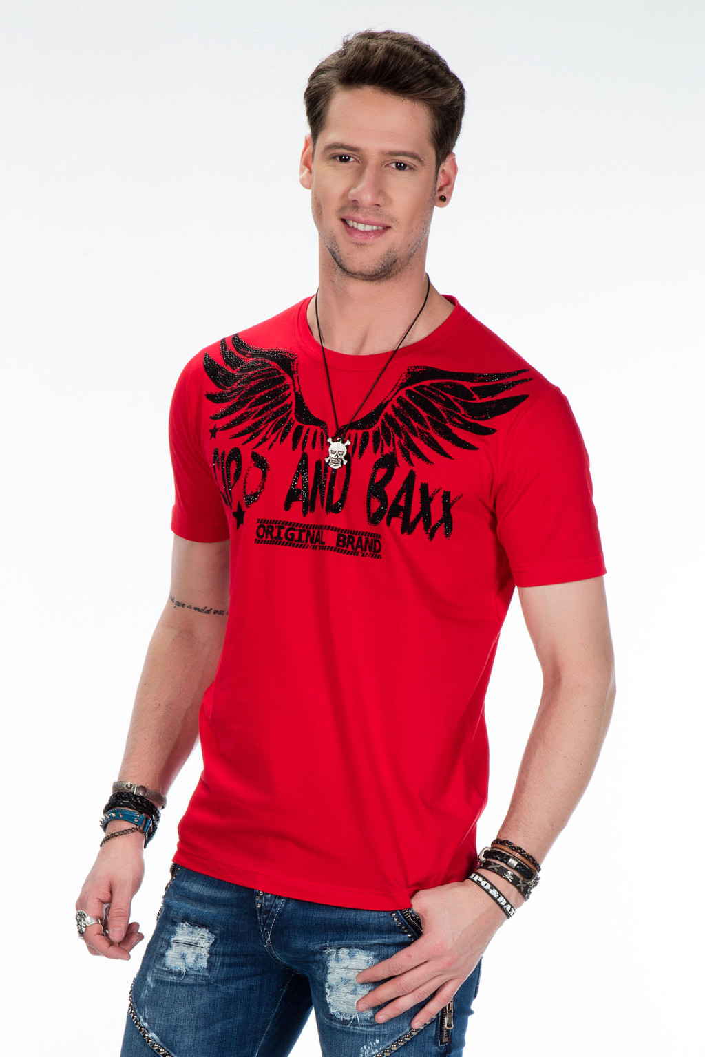 Ezzel a Cipo & Baxx pólóval bárhol is jársz, szemet gyönyörködtető leszel - az elülső és hátulsó vagány minták, amelyeket csillogó kövek díszítenek, kiemelik a dizájnt. A koponya, a szárnyak és a márkaelemek őrült megjelenést kölcsönöznek, amit a klasszikus kerek nyakkivágás egészít ki. A pamut és elasztán kiváló minőségű kidolgozásának köszönhetően a ruhadarab kényelmes viseletet is biztosít.