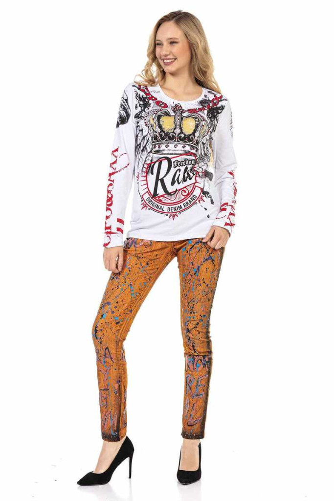 Ennél szokatlanabb már nem is lehetne! Ezek a Cipo & Baxx farmernadrágok igazán lenyűgözőek és nem lehet őket eltéveszteni. Az 5 zsebes modell pamutkeverékből készült, és karcsú, nőies, testhez simuló szabással érkezik – így szorosan simul a testhez, és tökéletesen kiemeli az alakot. A különleges darab azonban a nagyszerű, teljes felületű minta, amelyen többszínű festékfoltok és feliratok láthatók. A hátsó zsebek tökéletesen kiemelkednek, és teszik teljessé a szuper megjelenést.