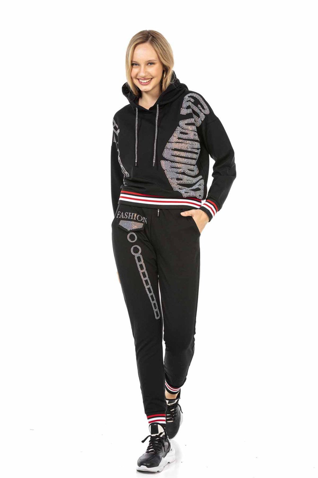 Ez a Cipo & Baxx Szabadidőruha nagyszerű kiegészítője a sportnak és a szabadidőnek. A kétrészes modellhez egy kényelmes, rugalmas derekú melegítőnadrág és egy melegen tartó kapucnis pulóver tartozik. A felső és a nadrág elegáns láncmotívumokkal díszített, csillogó kövekkel díszítve.