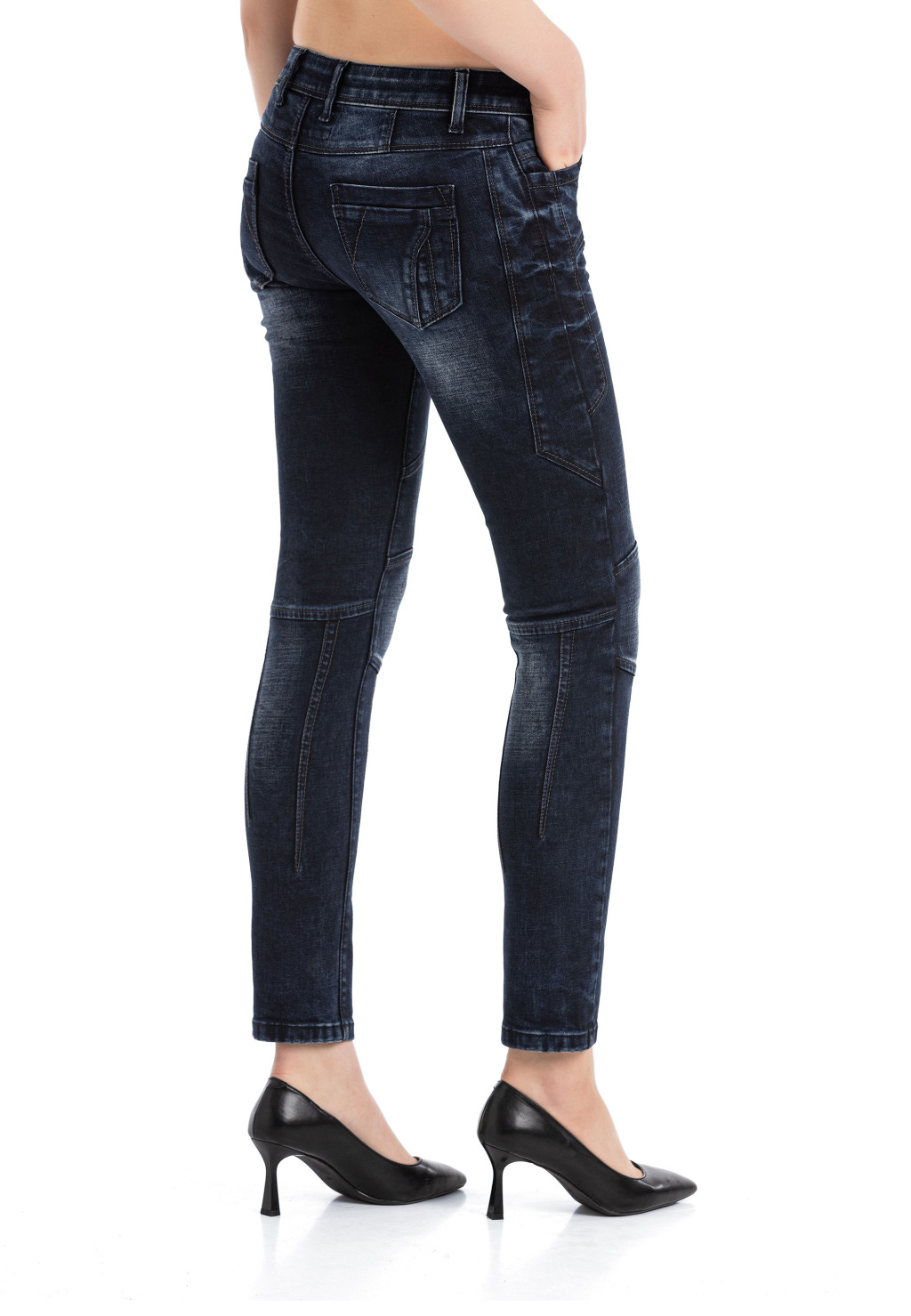 A farmernadrágok továbbra is ultramodernek. A Cipo & Baxx bemutatja ezt a női karcsúsított modellt, amely felugrik a trendek szekerére, és minden öltözékhez hozzáad egy bizonyos különlegességet. A kényelem és a divatos megjelenés itt kéz a kézben jár. A feltűnő díszvarrások és a divatos mosás még modernebbé teszik ezeket a nadrágokat.