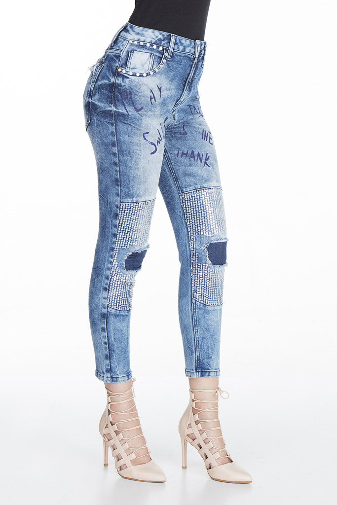 WD314 – Női farmer strasszokkal, feliratokkal és foltokkal