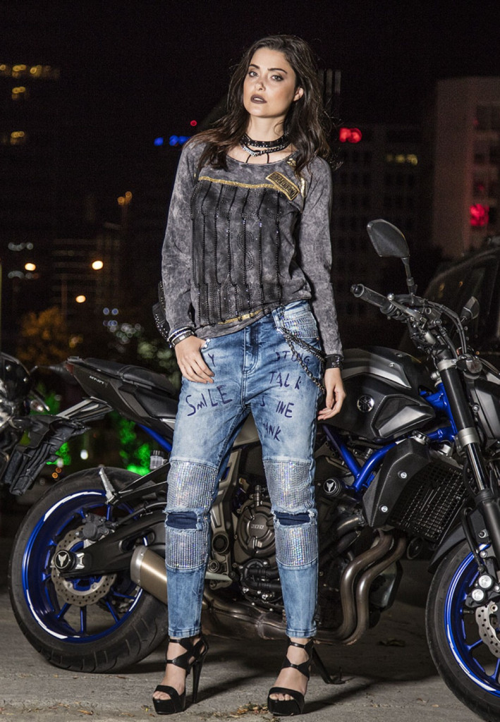 Ez a feltűnő, skinny szabású női farmer szokatlan dizájnnal büszkélkedhet: a combokon lévő csillogó strassz applikációk, a stílusos, rombusz alakú elemek és a nyomtatott feliratok városi, utcai stílusú jelleget kölcsönöznek a nadrágnak. A ráhelyezett foltok hűvös kontrasztot alkotnak a divatos mosással. A rugalmas pamutkeveréknek köszönhetően a nadrág nemcsak stílusos, hanem kényelmes is – tökéletes a divattudatos nők számára, akik szeretnének kitűnni maguk közül. Ideális magas sarkú cipővel vagy sportcipővel kombinálva.