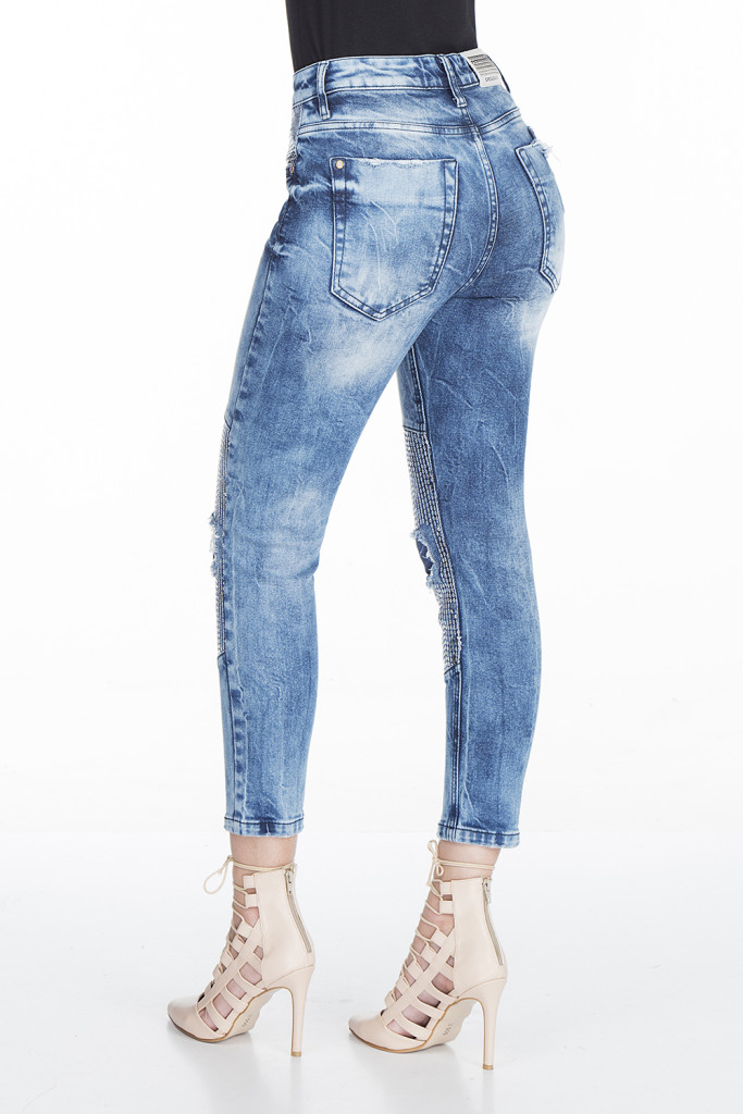 Ez a feltűnő, skinny szabású női farmer szokatlan dizájnnal büszkélkedhet: a combokon lévő csillogó strassz applikációk, a stílusos, rombusz alakú elemek és a nyomtatott feliratok városi, utcai stílusú jelleget kölcsönöznek a nadrágnak. A ráhelyezett foltok hűvös kontrasztot alkotnak a divatos mosással. A rugalmas pamutkeveréknek köszönhetően a nadrág nemcsak stílusos, hanem kényelmes is – tökéletes a divattudatos nők számára, akik szeretnének kitűnni maguk közül. Ideális magas sarkú cipővel vagy sportcipővel kombinálva.