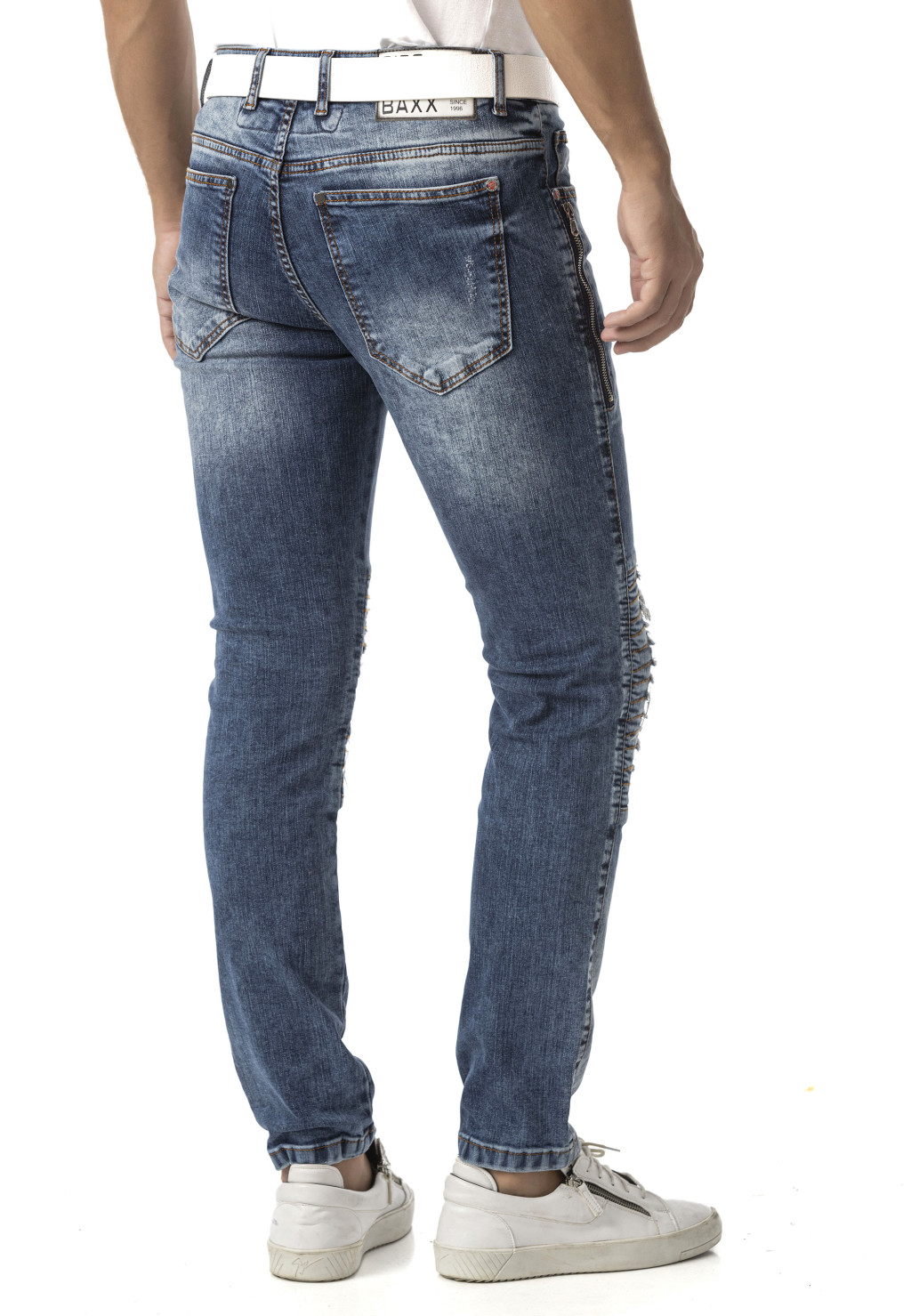 A CIPO & BAXX CD898 Slim Fit férfi farmernadrágja a modern stílust ötvözi a maximális kényelemmel. A robusztus farmeranyag tartósságot biztosít, míg a szűk szabású, szűk szabás kiemeli a karcsú sziluettet. A combokon található feltűnő, dekoratív és szaggatott hatások divatos, használt megjelenést kölcsönöznek a nadrágnak. Különleges kiemelés az oldalsó cipzár, amely városias jelleget kölcsönöz a farmernek. Ideális hétköznapi viselethez vagy divatos utcai viselet kombinációkhoz.