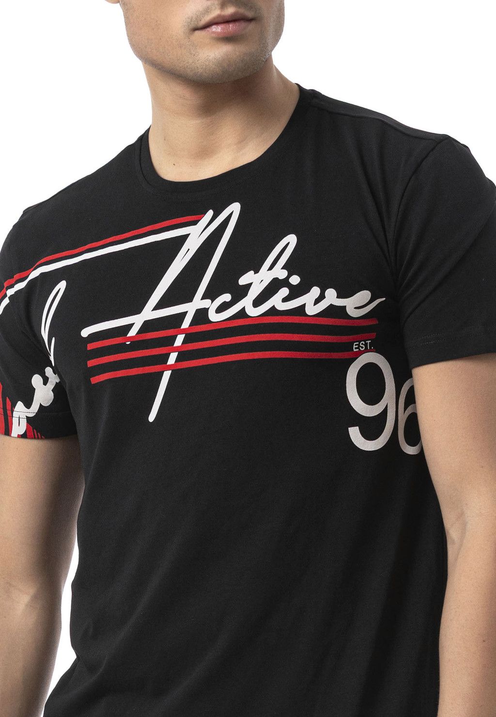 A CT796 férfi póló sportos, modern stílusával lenyűgöző. Klasszikus fekete színben kapható, és feltűnő "Active" feliratú mintával és piros díszítéssel rendelkezik a mellkasán. A kerek nyak kényelmes viseletet biztosít, míg a normál szabás laza megjelenést garantál. A kiváló minőségű Empire mintának köszönhetően a fazon sok mosás után is megőrzi formáját. Tökéletes szabadidős, mindennapi viseletre vagy sporttevékenységekhez. Kombináld farmerrel vagy rövidnadrággal a stílusos megjelenésért.