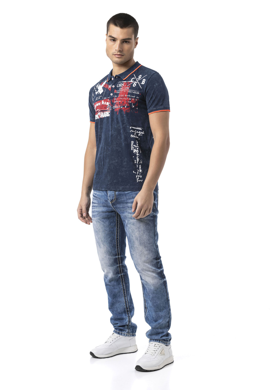 CT795 Férfi póló póló nyomtatással és mosással - Normál szabás