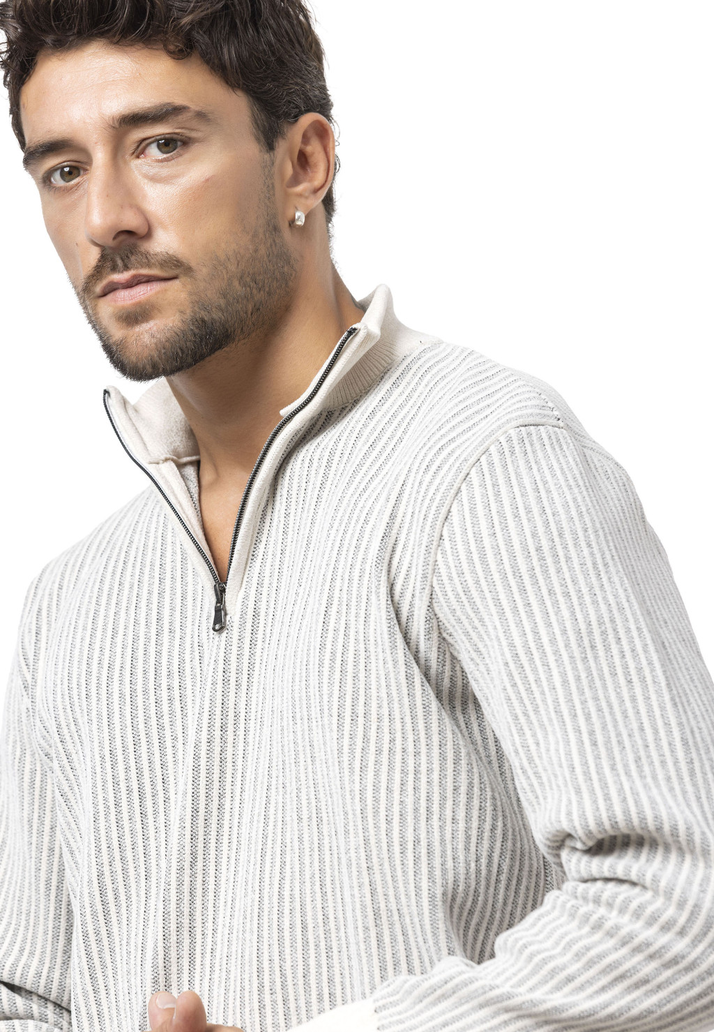 Klassisch, maskulin und stilvoll: Dieser hochwertige Herren-Strickpullover mit Reißverschluss ist ein echtes Must-have für kühle Tage. Das dezente Rippstrickmuster in Schwarz-Melange verleiht dem Pullover eine elegante Struktur und macht ihn vielseitig kombinierbar – egal ob fürs Büro, den Alltag oder den Abend-Look.