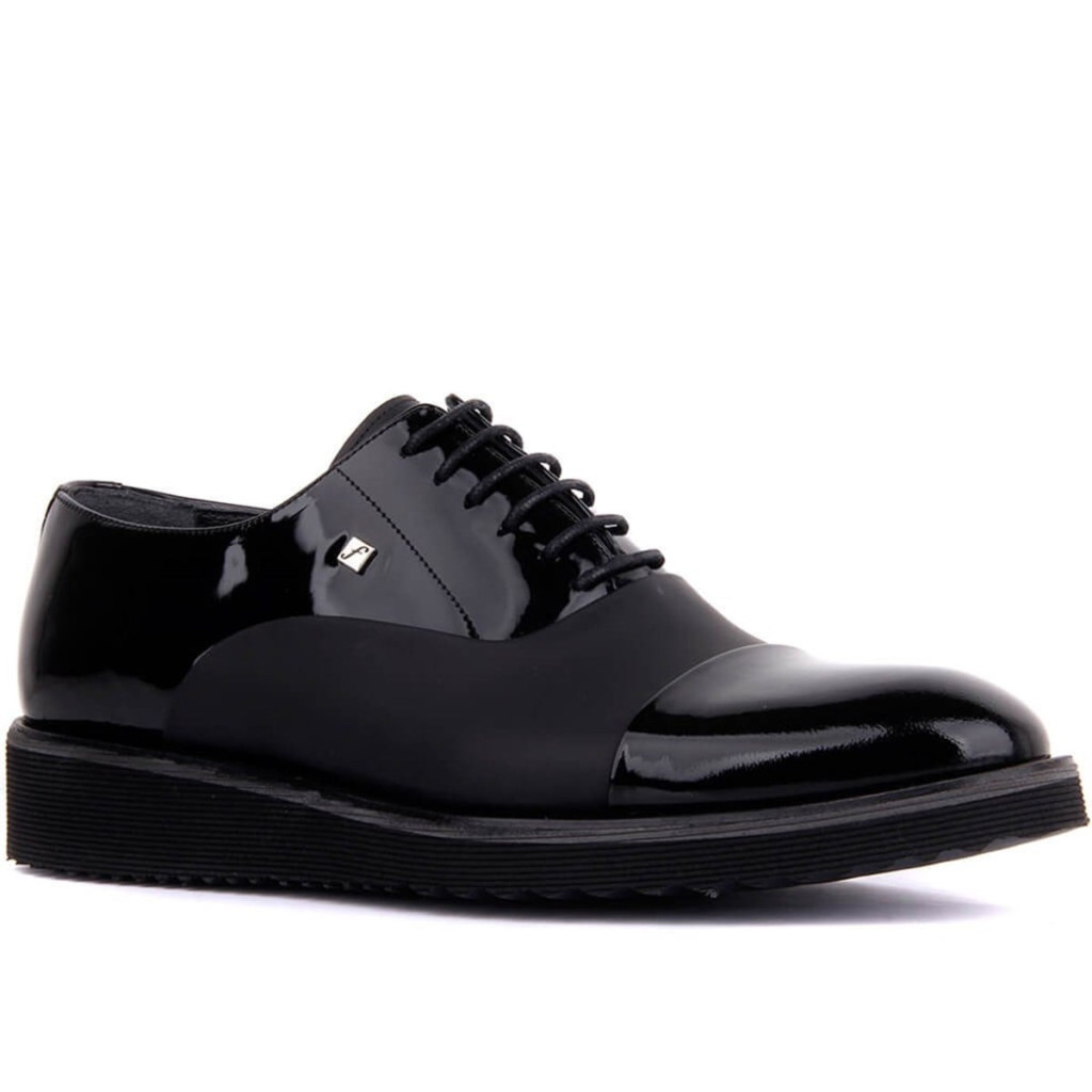 Egy rendkívül elegáns, fekete lakkbőr férfi cipő, amely a klasszikus és a modern utcai stílust ötvözi.
